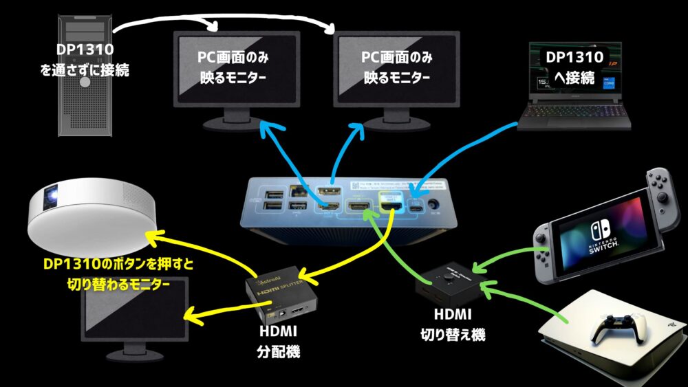 普通に使うとDP1310に接続できる機器は、PS5とPCの1つずつなので、上の動画のようにPS5・PC・Switchを切り替えることはできません。