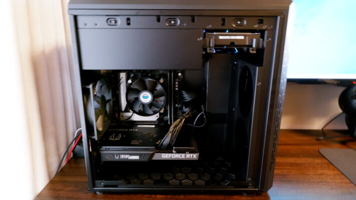 内部構造は、ケースがコンパクトですが結構ゆとりがあります。このままの構成なら、グラボがもっと長くても入りそうですが、前にラジエーターを付ける場合は厳しそうですね。
