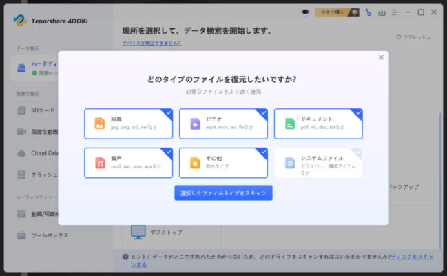 - 4DDiGで無料スキャンを試す:まずは無料でデータが検出できるか確認しましょう
