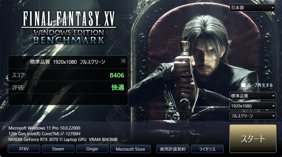 設定はフルHDで、最高品質にしています。スコアは14961で、とても快適。